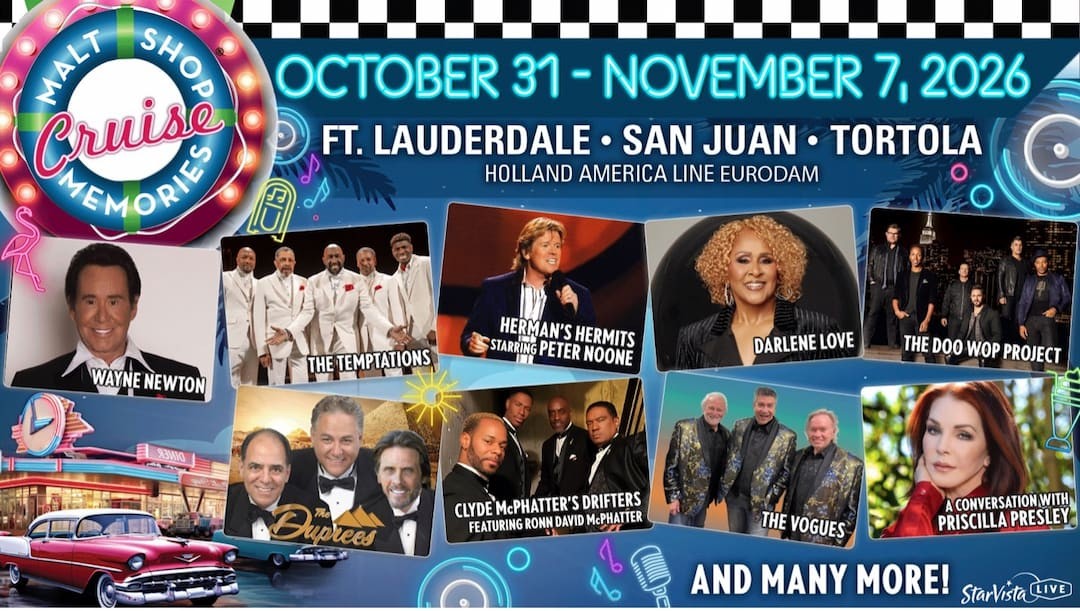Come join the biggest Rock ‘n’ Roll Party at Sea, the 2026 Malt Shop Memories Cruise! Experience over 50 LIVE performances featuring Wayne Newton, The Temptations, Herman’s Hermits starring Peter Noone, Darlene Love, The Doo Wop Project, The Duprees, Clyde McPhatter’s Drifters featuring Ronn David McPhatter, The Vogues, The Fortunes, The Coasters, Mel Carter, Frank Pizarro, former lead singer of The Platters, Ron Dante of The Archies & The Cufflinks, Under the Streetlamp, Linda Gail Lewis sister of Jerry Lee Lewis, Johnny Farina, Bobby Wilson, plus A Conversation with Priscilla Presley, and many more! Relive the good ole days of rock ‘n’ roll with your favorite performers and enjoy over 25 celebrity interactive events as we visit the beautiful ports of San Juan and Tortola.