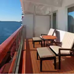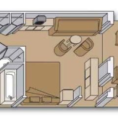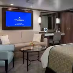 These large, comfortable suites feature a spacious sitting area with floor-to-ceiling windows overlooking a private verandah, two lower beds convertible to one queen-size bed – the signature Mariner’s Dream™ bed with plush Euro-Top mattresses, and one sofa bed for one person. The bathroom includes a dual-sink vanity, full-size whirlpool bath and shower, and an additional shower stall. The configuration of staterooms may vary from the images shown.