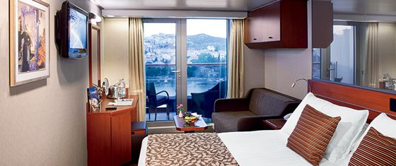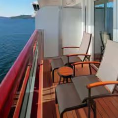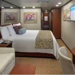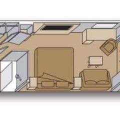 Filled with light from floor-to-ceiling windows overlooking a private verandah, these staterooms include a sitting area, two lower beds convertible to one queen-size bed – the signature Mariner’s Dream™ bed with plush Euro-Top mattresses, and bath tub with premium massage showerheads. The configuration of staterooms may vary from the images shown.